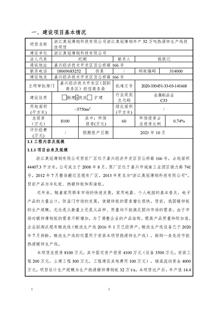 浙江奧冠薄鋼科技有限公司 浙江奧冠薄鋼年產(chǎn)32萬噸熱浸鋅生產(chǎn)線技改項目 環(huán)境影響評價公告信息