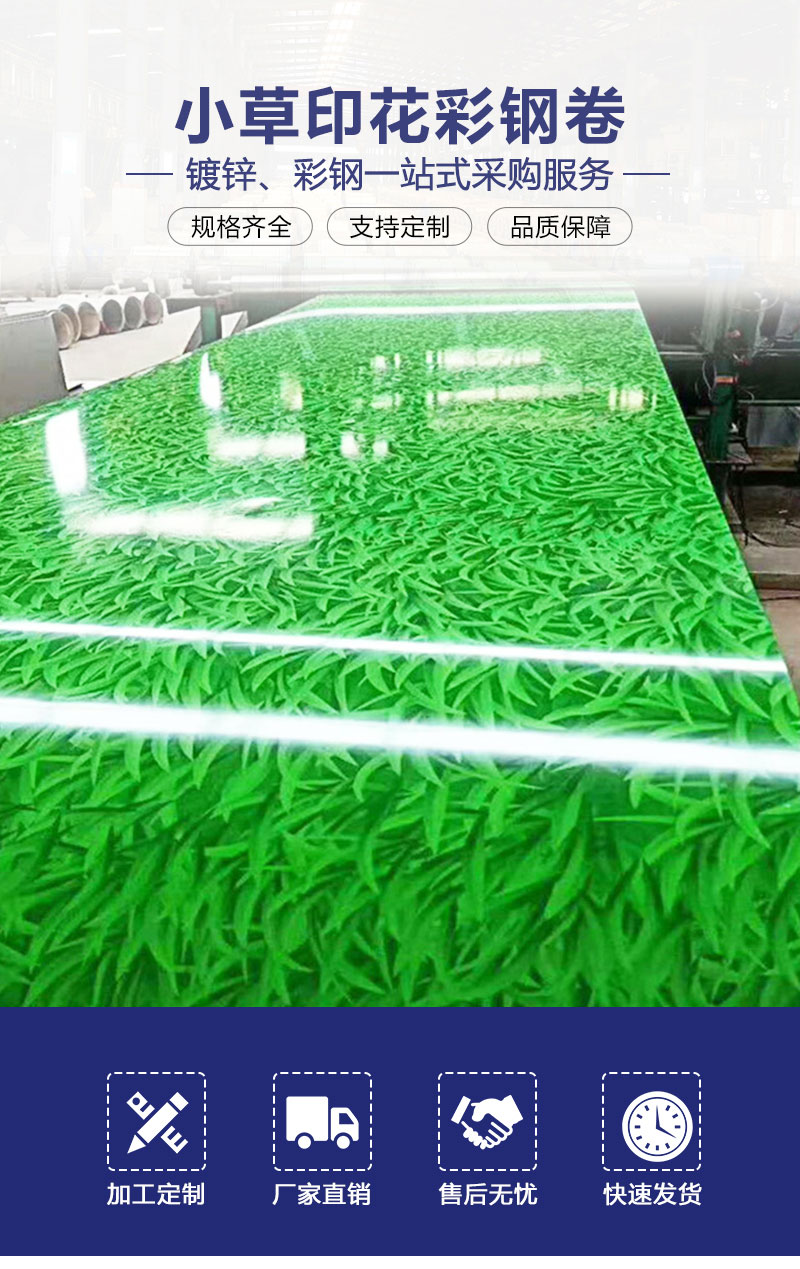 小草印花彩涂卷具有輕質(zhì)、美觀和良好的防腐蝕性能,又可直接加工,主要應(yīng)用于廣告業(yè)、建筑業(yè)、家電行業(yè)、電器行業(yè)、家具行業(yè)及運輸業(yè)。